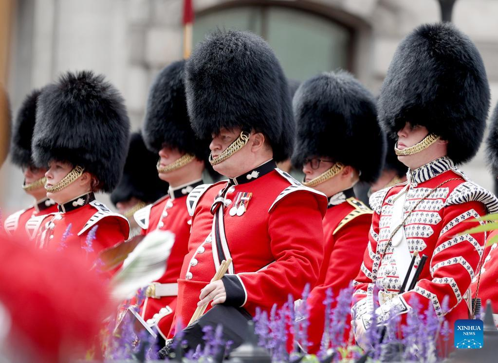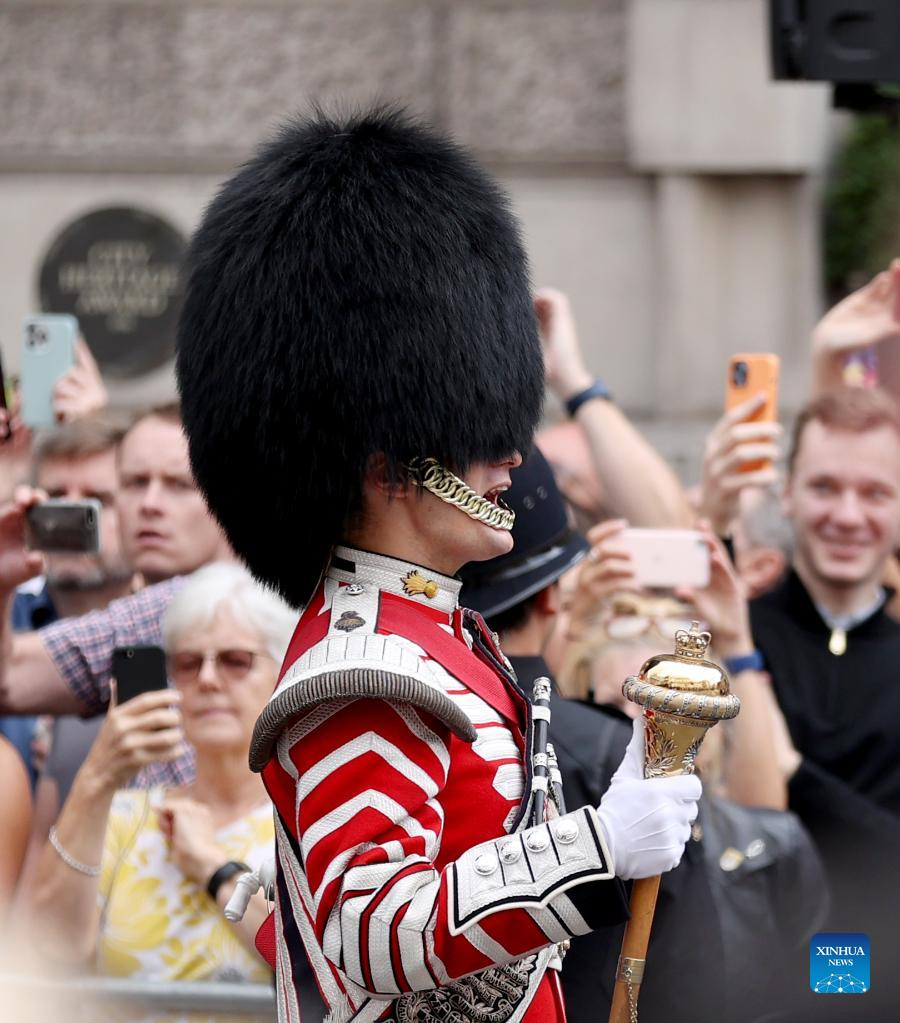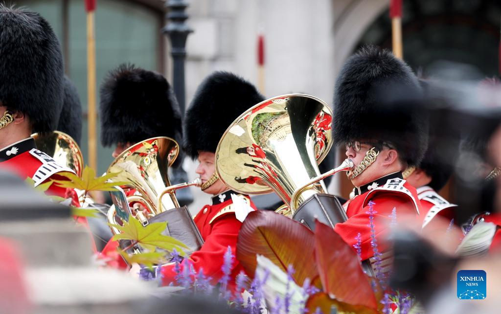A band member is seen during a ceremony where the Accession Proclamation for King Charles III is read at the Royal Exchange in the City of London, Britain, Sept. 10, 2022. King Charles III was formally proclaimed Britain's new monarch at a meeting of the Accession Council at St James's Palace on Saturday. (Xinhua/Li Ying)