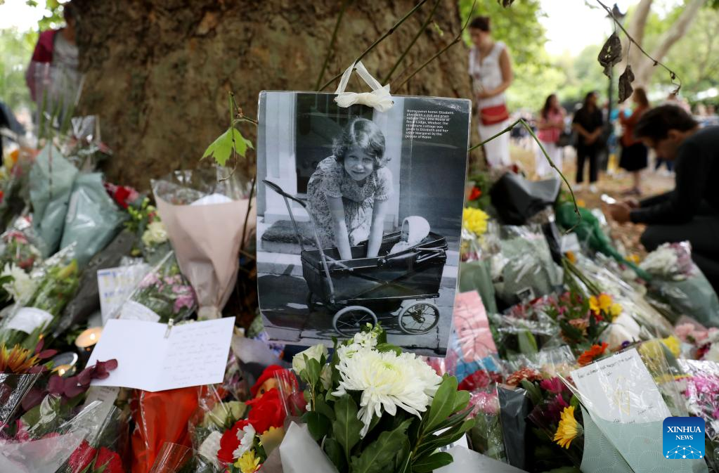 A photo is seen amid flowers commemorating the late Queen Elizabeth II at Green Park in London, Britain, Sept. 10, 2022. Queen Elizabeth II, Britain's longest-reigning monarch in history, has died aged 96, Buckingham Palace announced on Thursday. (Xinhua/Li Ying)