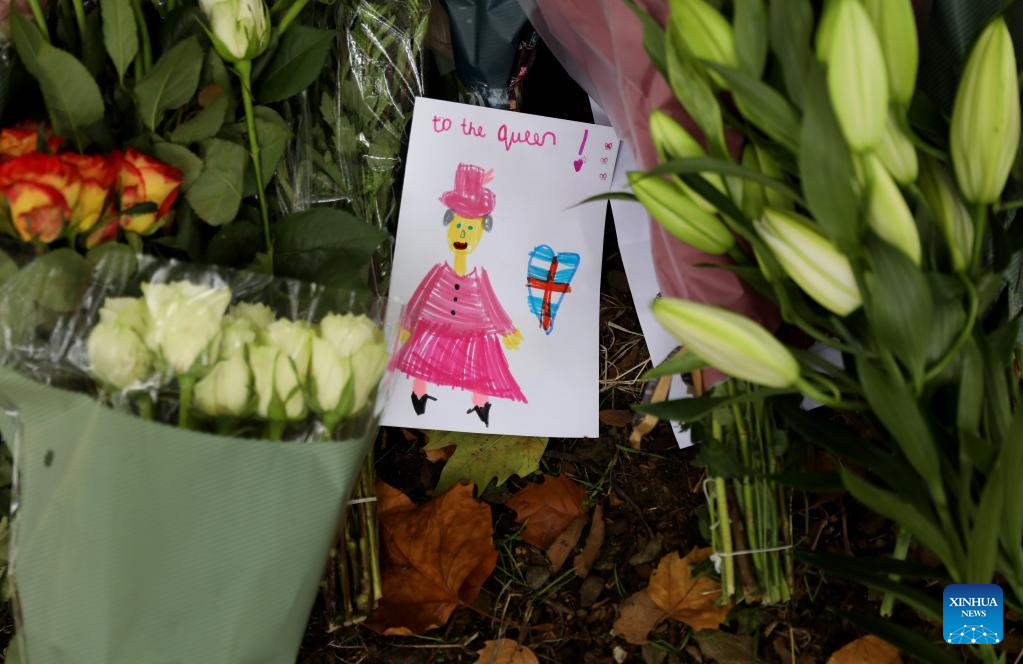 A card is seen amid flowers commemorating the late Queen Elizabeth II at Green Park in London, Britain, Sept. 10, 2022. Queen Elizabeth II, Britain's longest-reigning monarch in history, has died aged 96, Buckingham Palace announced on Thursday. (Xinhua/Li Ying)