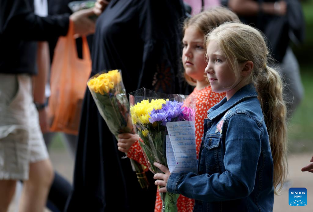Two girls hold flowers as they walk to Buckingham Palace to commemorate the late Queen Elizabeth II in London, Britain, Sept. 10, 2022. Queen Elizabeth II, Britain's longest-reigning monarch in history, has died aged 96, Buckingham Palace announced on Thursday. (Xinhua/Li Ying)