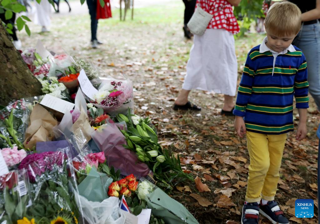 A boy walks past flowers commemorating the late Queen Elizabeth II at Green Park in London, Britain, Sept. 10, 2022. Queen Elizabeth II, Britain's longest-reigning monarch in history, has died aged 96, Buckingham Palace announced on Thursday. (Xinhua/Li Ying)
