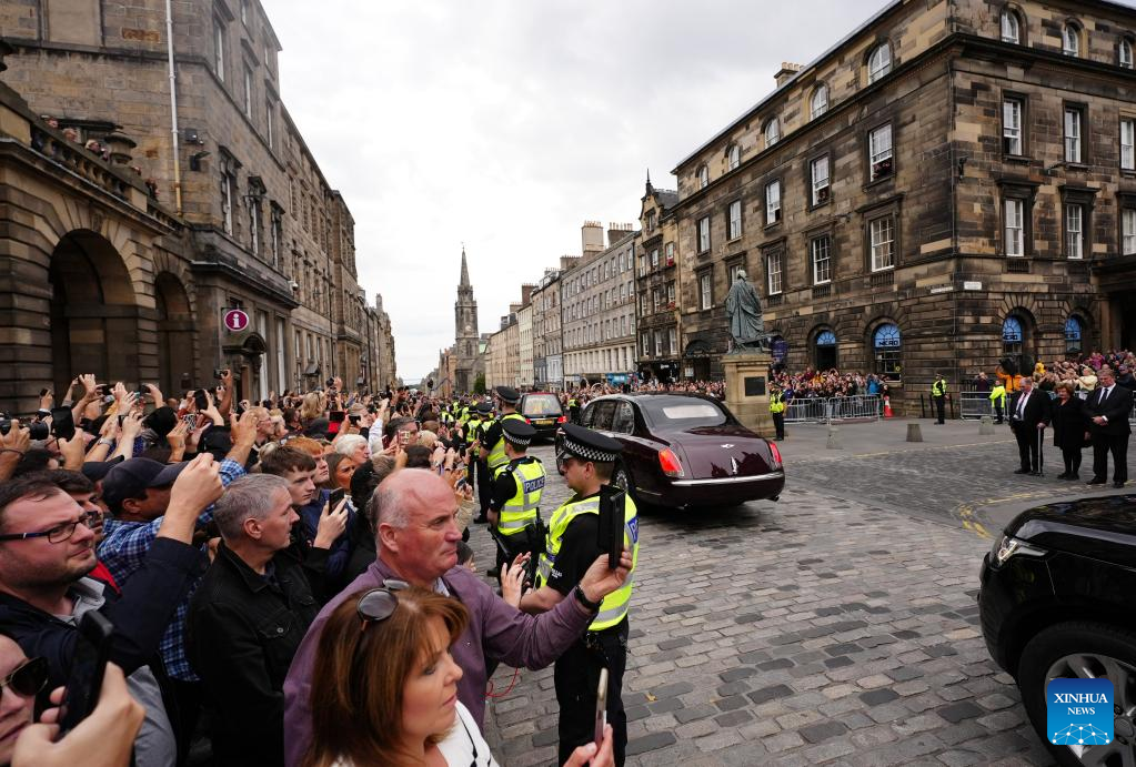 People watch the cortege with the hearse carrying the coffin of Queen Elizabeth II in Edinburgh, Britain, Sept. 11, 2022. The hearse carrying the body of Queen Elizabeth II left Balmoral Castle and arrived at Edinburgh on Sunday. (Photo by Zhang Ruijun/Xinhua)