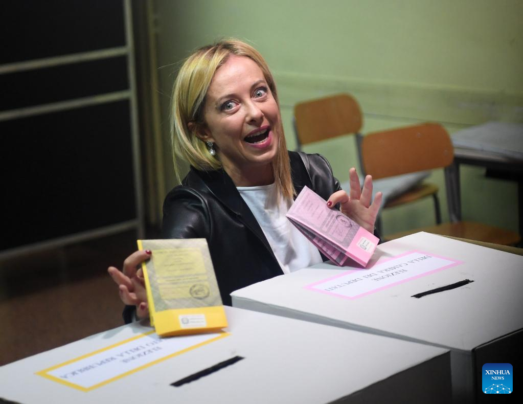 Giorgia Meloni, leader of the Brothers of Italy party, shows her ballots at a polling station in Rome, Italy, Sept. 25, 2022. (Xinhua/Jin Mamengni)
