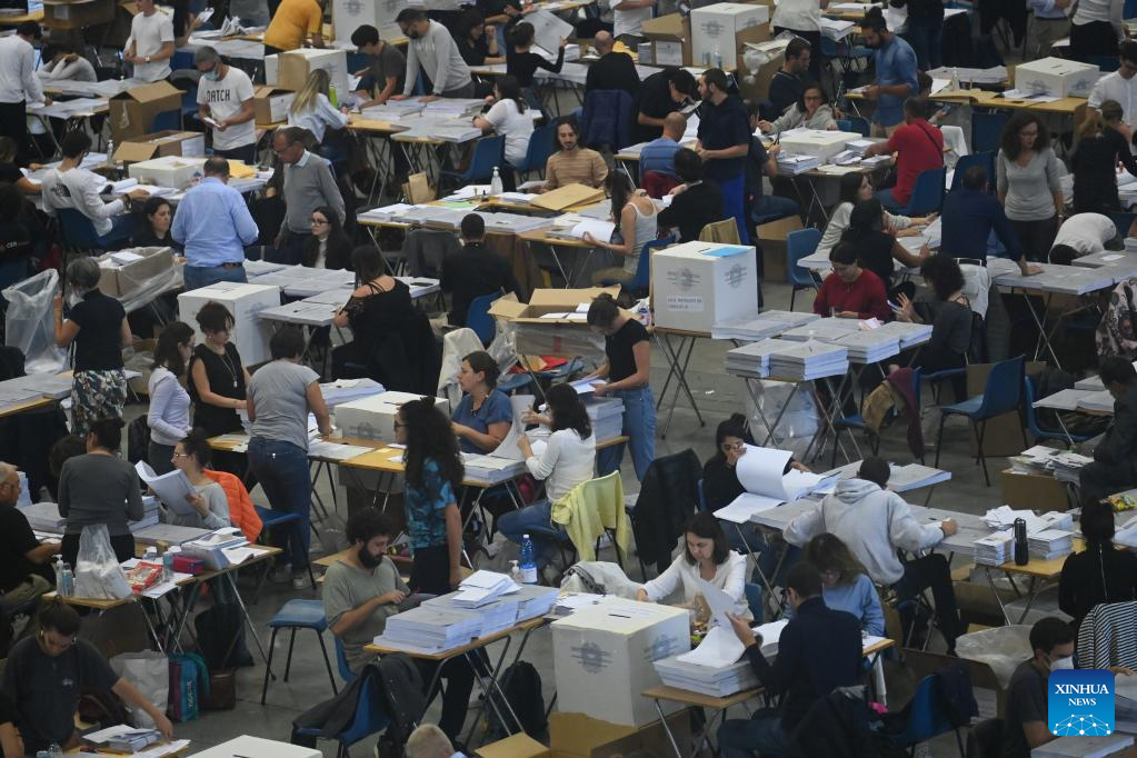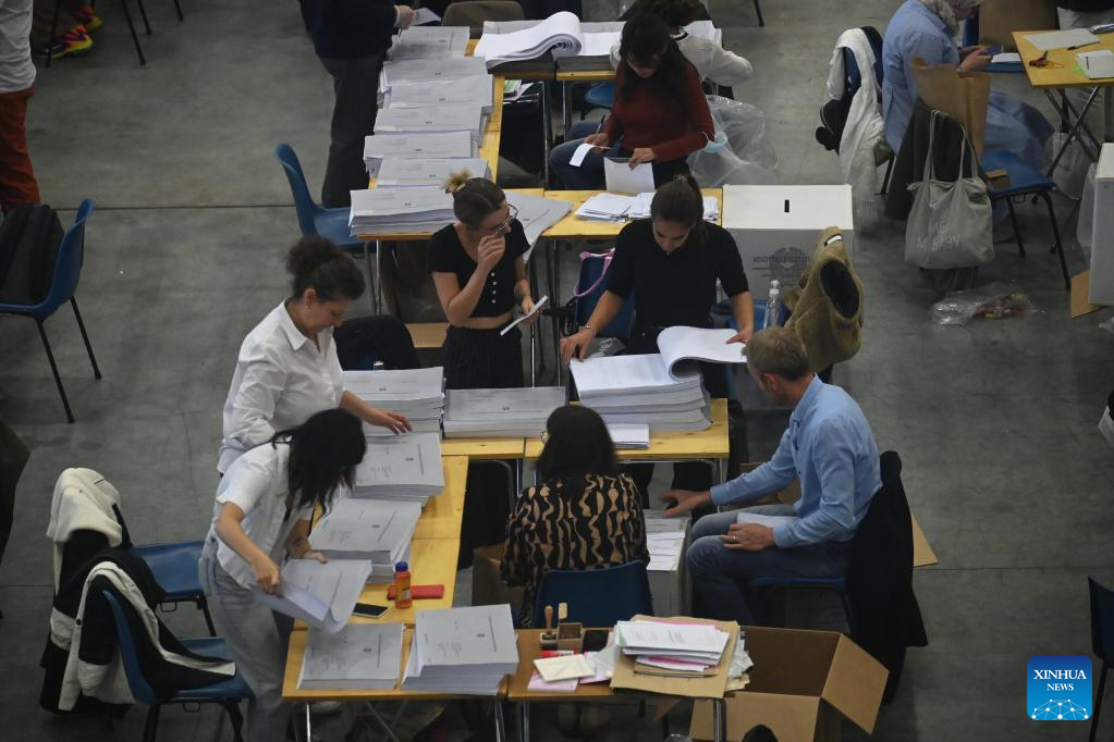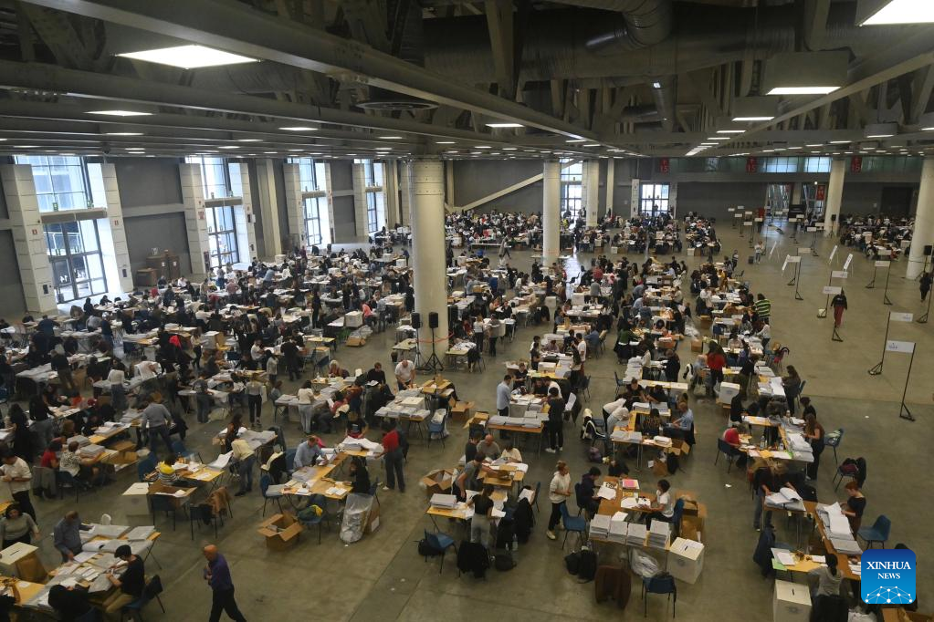 Staff members count ballots voted by Italian citizens living abroad in Bologna, Italy, Sept. 25, 2022. (Photo by Gianni Schicchi/Xinhua)