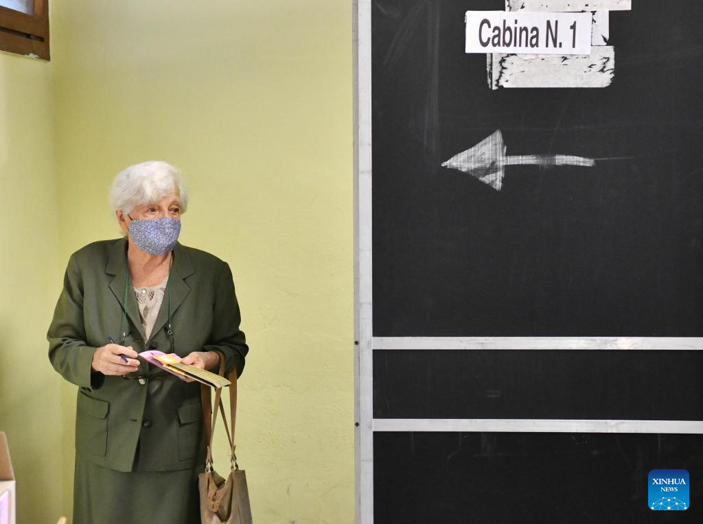 A resident prepares to vote at a polling station in Rome, Italy, Sept. 25, 2022. (Xinhua/Jin Mamengni)