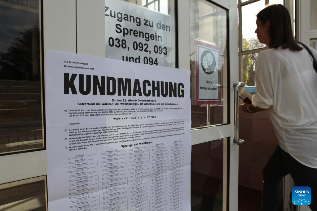 A voter walks into a polling station in Vienna, Austria, on Oct. 9, 2022. Austrian President Alexander Van der Bellen was set to win a second term as he was projected to get over 50 percent of the votes at the presidential election on Sunday and thus avoid a run-off vote. (Photo by Wang Zhou/Xinhua)