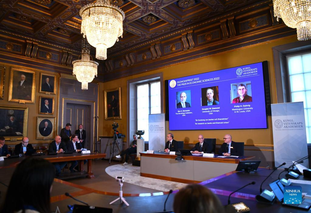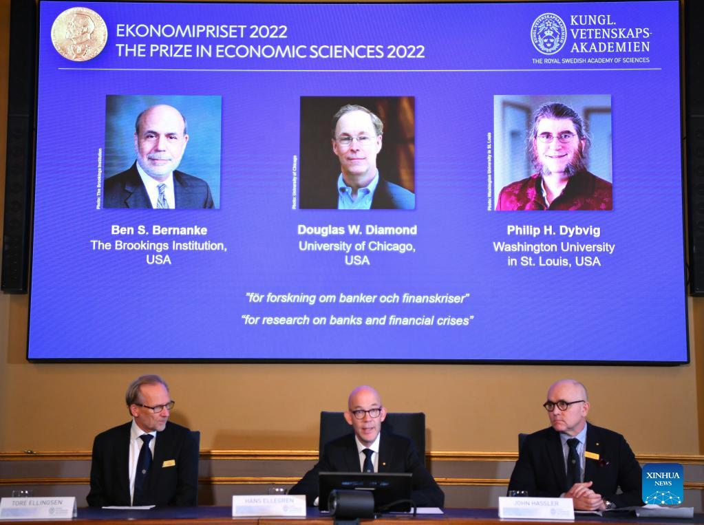 The announcement of the 2022 Nobel Prize in Economic Sciences is held in Stockholm, Sweden, Oct. 10, 2022. The Royal Swedish Academy of Sciences on Monday decided to award the 2022 Sveriges Riksbank Prize in Economic Sciences in Memory of Alfred Nobel to Ben S. Bernanke, Douglas W. Diamond and Philip H. Dybvig "for research on banks and financial crises." (Xinhua/Ren Pengfei)