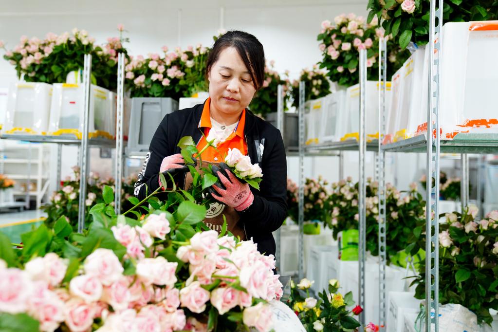 A worker arranges a bunch of roses at a rose plantation of a modern agricultural industrial park in Zhaoxian Town, Juxian County of east China's Shandong Province, Oct. 11, 2022. Zhaoxian Town is a cut flower production base in Shandong. The local cut flower industry has developed well in recent years and become a leading industry. (Xinhua/Guo Xulei)