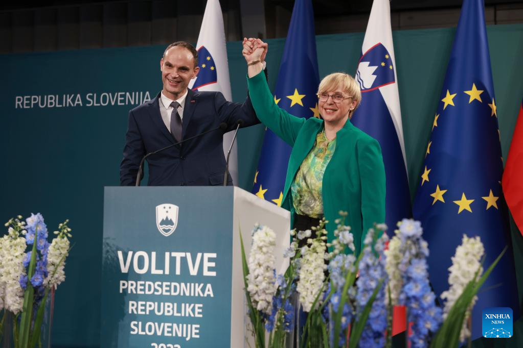 Anze Logar (L) and Natasa Pirc Musar, the two best positioned candidates, congratulate each other to participate in the second round of presidential election in Ljubljana, Slovenia, Oct. 23, 2022. Slovenia is due to hold the second round of presidential election on Nov. 13 after no candidate got majority in the first round held on Sunday.