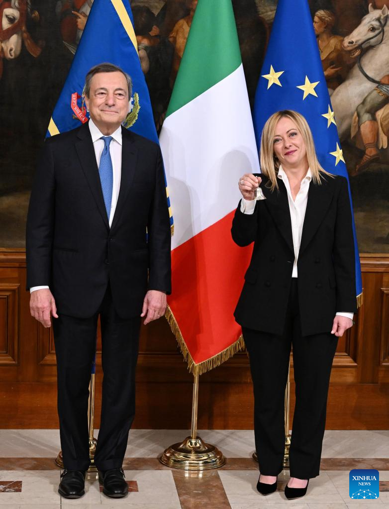 Though Meloni was sworn in on Saturday, outgoing Prime Minister Mario Draghi ceremonially passed power to her Sunday in a televised meeting at Palazzo Chigi, the official seat of Italy's government. (Photo by Alberto Lingria/Xinhua)