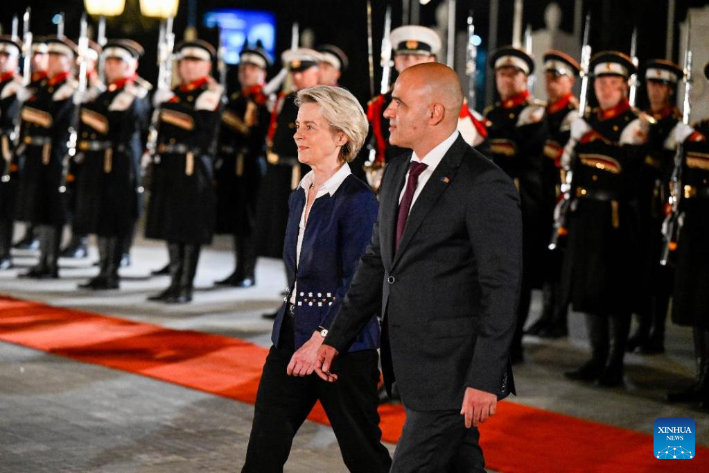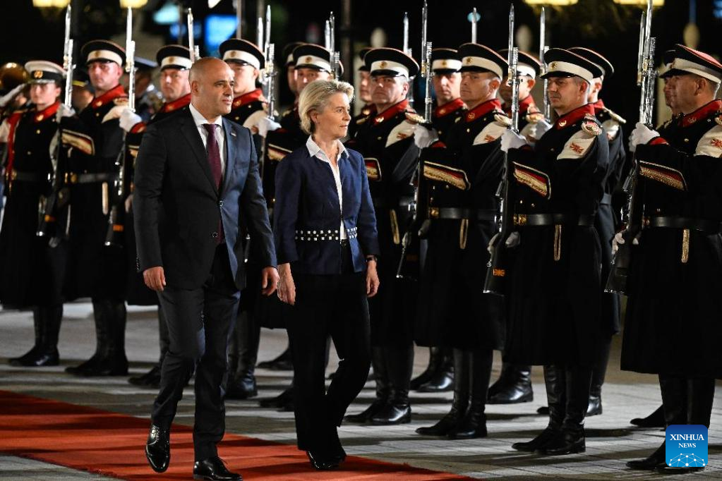 President of the European Commission Ursula von der Leyen (R), accompanied by North Macedonia's Prime Minister Dimitar Kovachevski (L), inspects the guard of honor in Skopje, North Macedonia, on Oct. 26, 2022. The European Union (EU) will provide 500 million euros (504 million U.S. dollars) in grants for the Western Balkan countries to tackle energy crisis, European Commission chief said here Wednesday. (Photo by Tomislav Georgiev/Xinhua)