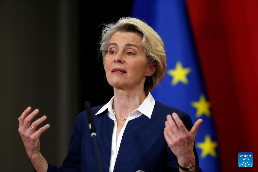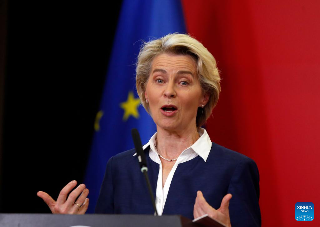 President of the European Commission Ursula von der Leyen speaks during a joint press conference with North Macedonia's Prime Minister (not pictured) in Skopje, North Macedonia, Oct. 26, 2022. The European Union (EU) will provide 500 million euros (504 million U.S. dollars) in grants for the Western Balkan countries to tackle energy crisis, European Commission chief said here Wednesday. (Photo by Tomislav Georgiev/Xinhua)