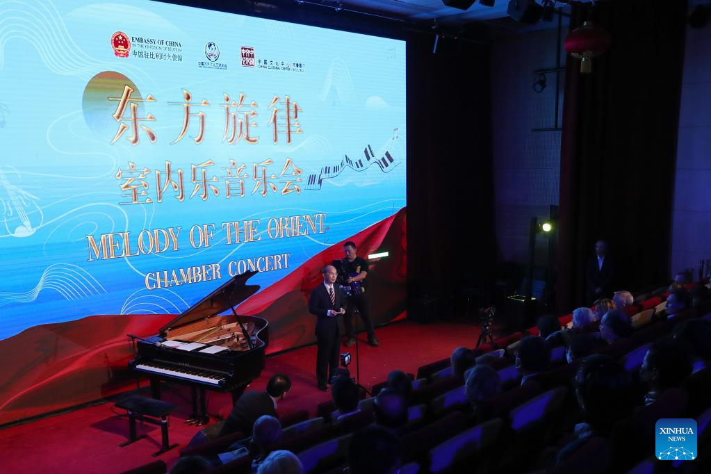 Chinese ambassador to Belgium Cao Zhongming speaks ahead of a chamber concert titled "Melody of the Orient" in Brussels, Belgium, Oct. 29, 2022. (Xinhua/Zheng Huansong)
