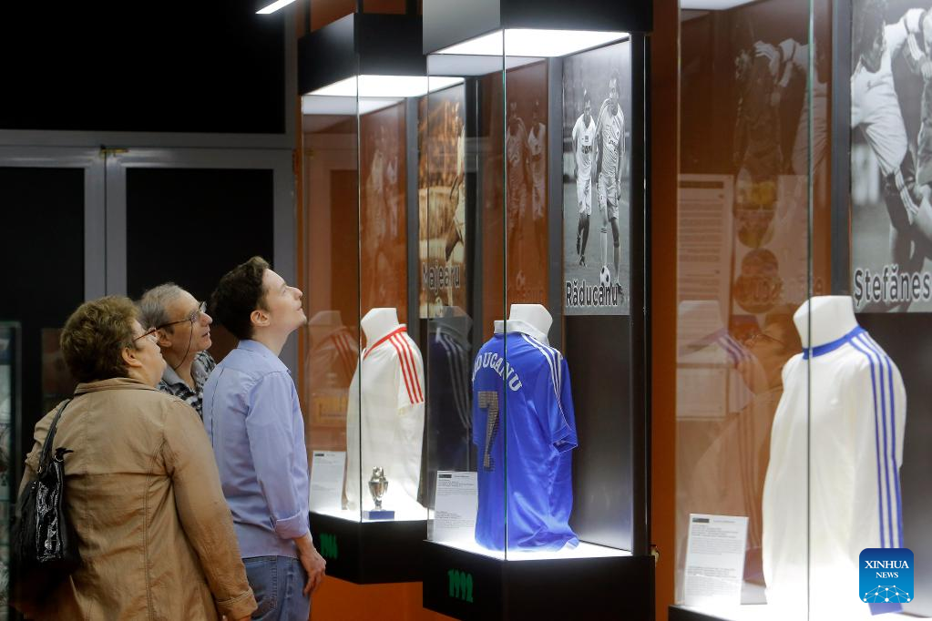 People watch items exhibited on the opening day of a football museum in Bucharest, Romania, Nov. 1, 2022. The museum, first of its kind in Romania, hosts various objects from football history, shirts and boots belonging to famous players and various recreational places. (Photo by Cristian Cristel/Xinhua)