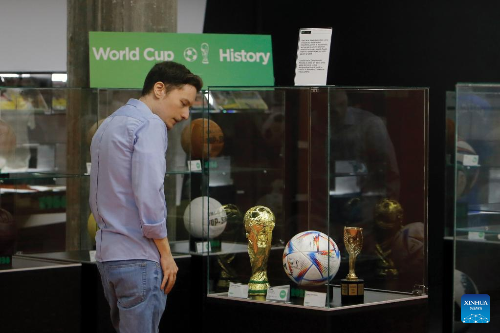 World Cup trophies and the official football for the upcoming FIFA World Cup Qatar 2022 are seen on the opening day of a football museum in Bucharest, Romania, Nov. 1, 2022. The museum, first of its kind in Romania, hosts various objects from football history, shirts and boots belonging to famous players and various recreational places. (Photo by Cristian Cristel/Xinhua)