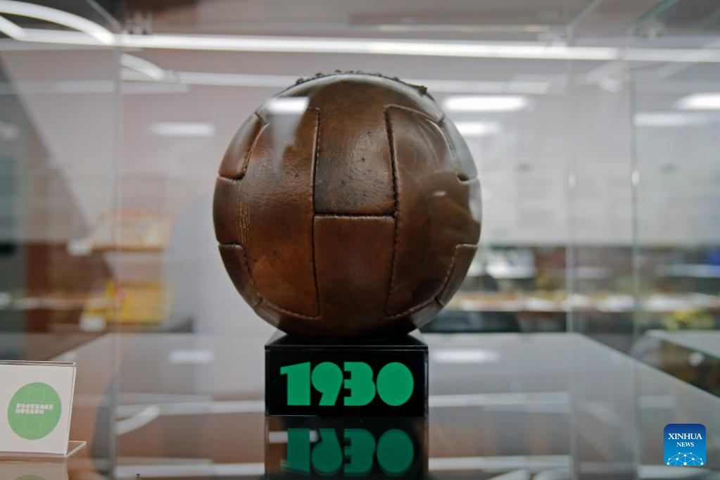 A replica of the official football for the first World Cup hosted by Uruguay in 1930 is seen on the opening day of a football museum in Bucharest, Romania, Nov. 1, 2022. The museum, first of its kind in Romania, hosts various objects from football history, shirts and boots belonging to famous players and various recreational places. (Photo by Cristian Cristel/Xinhua)