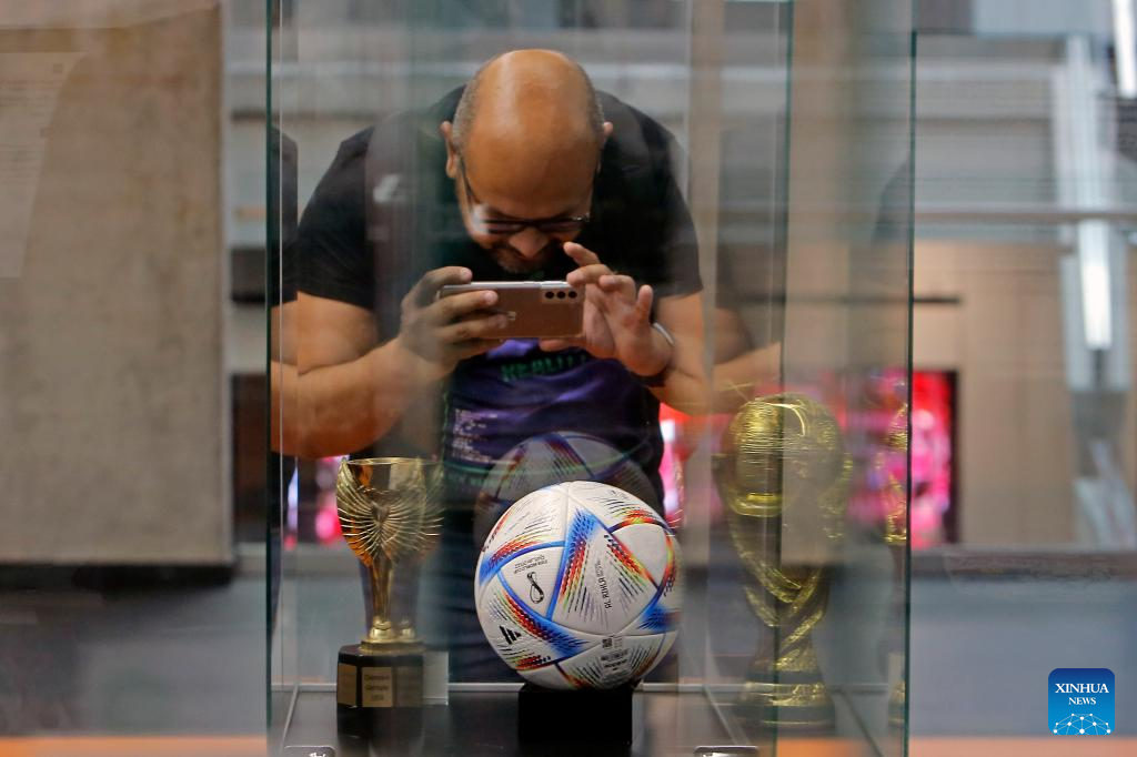 A visitor takes a picture of the official football for the upcoming FIFA World Cup Qatar 2022 on the opening day of a football museum in Bucharest, Romania, Nov. 1, 2022. The museum, first of its kind in Romania, hosts various objects from football history, shirts and boots belonging to famous players and various recreational places. (Photo by Cristian Cristel/Xinhua)