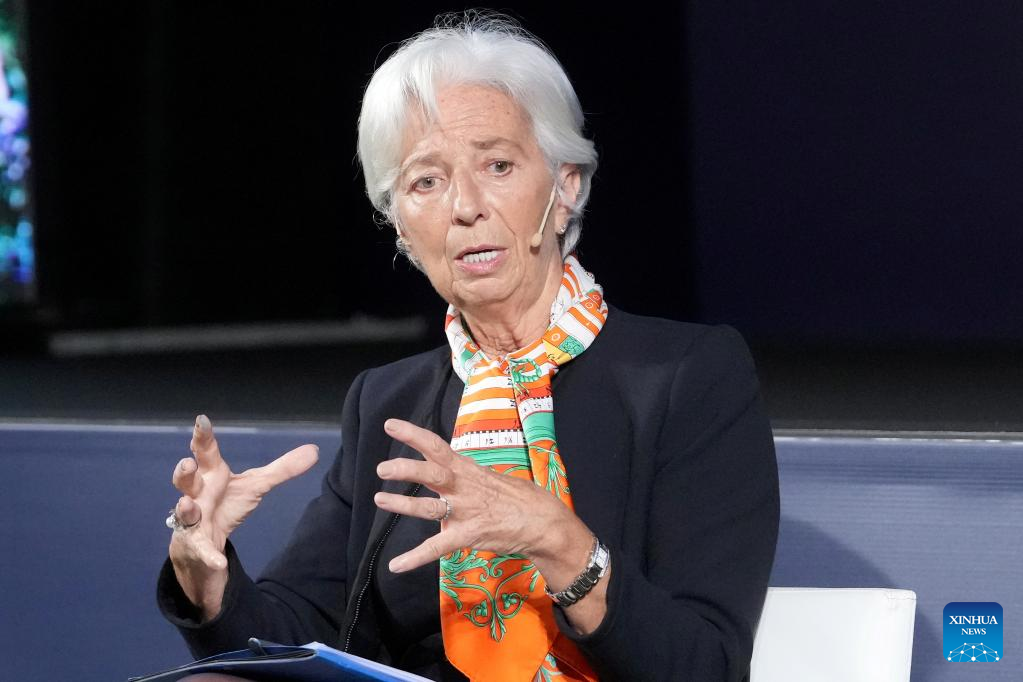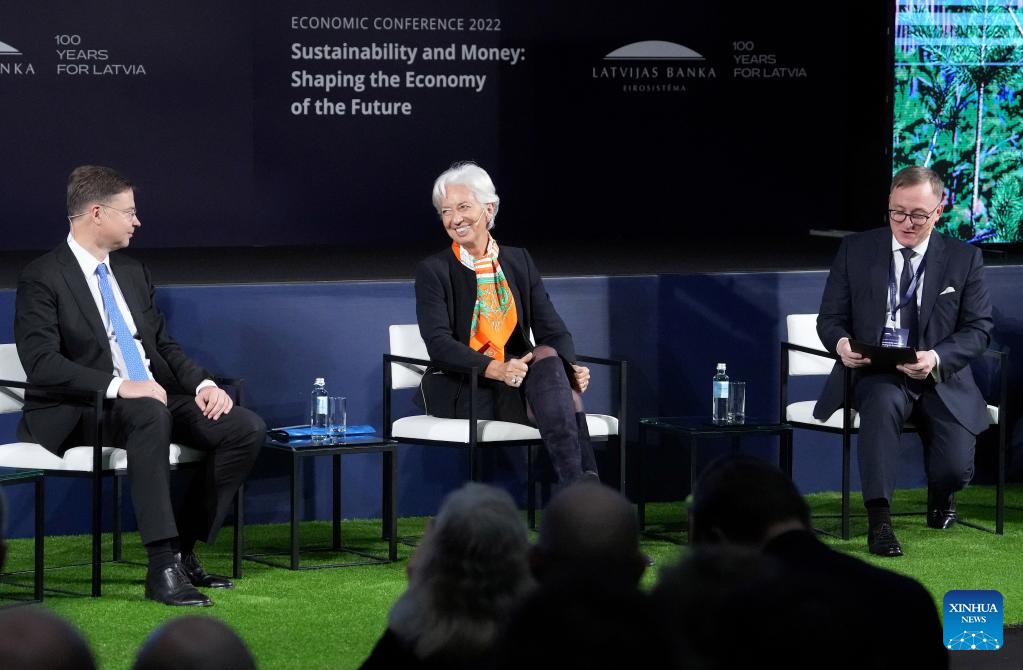 European Central Bank (ECB) President Christine Lagarde attends a conference hosted by the Latvian central bank in Riga, Latvia, on Nov. 3, 2022. Leading economists who spoke at the conference in Riga on Thursday foresaw a mild recession in the eurozone but warned that it will not suffice to curb inflation. (Photo by Edijs Palens/Xinhua)