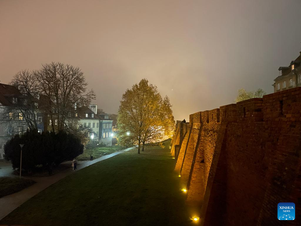 This mobile phone photo taken on Oct. 31, 2022 shows a smoggy night view of Warsaw Old Town in Warsaw, Poland. (Xinhua/Chen Chen)