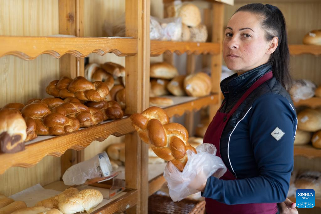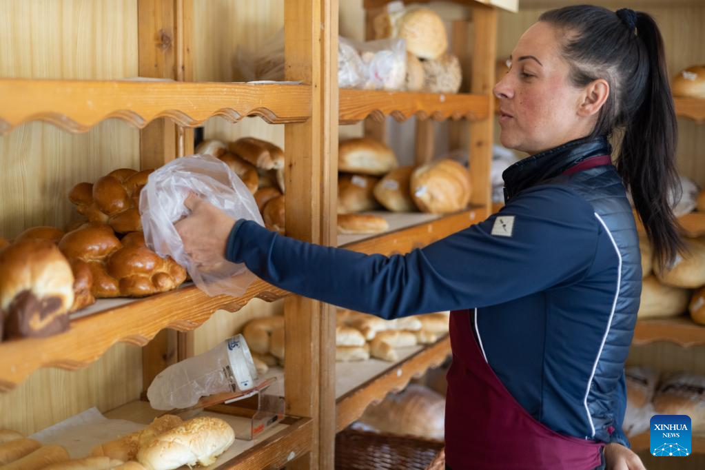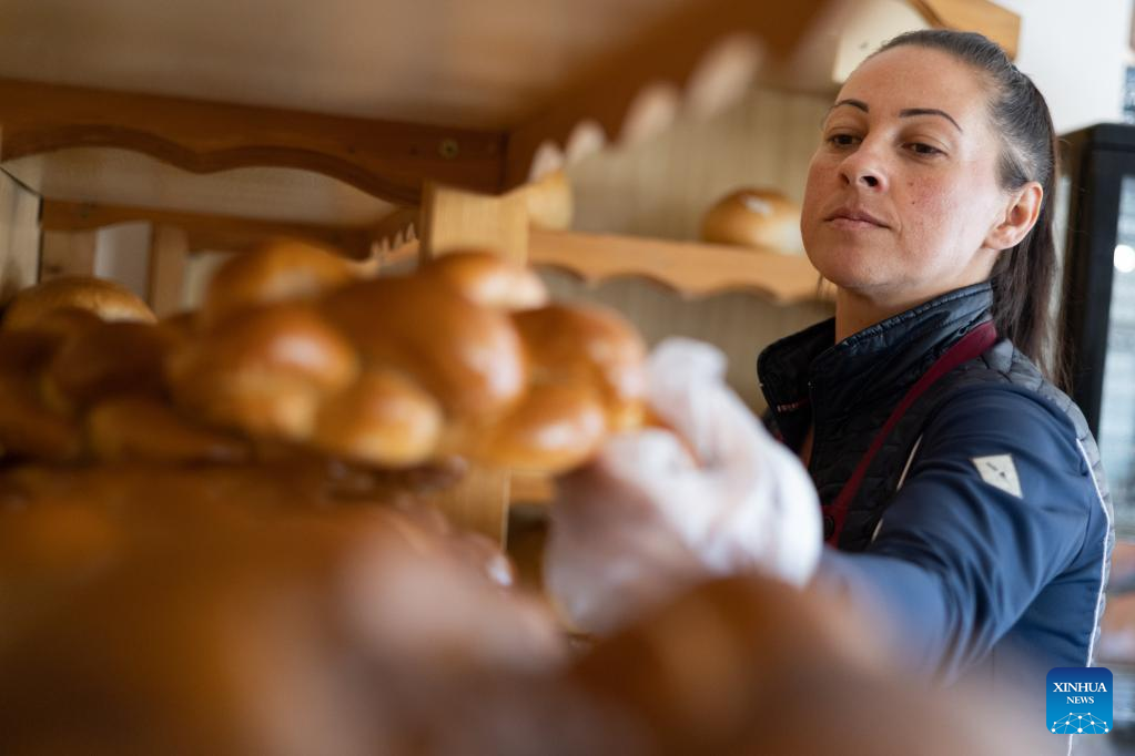 Margit Kiss, owner of the Kiss Bakery, works in her shop in Urom, a suburb of Budapest, Hungary, on Oct. 19, 2022.(Photo by Attila Volgyi/Xinhua)