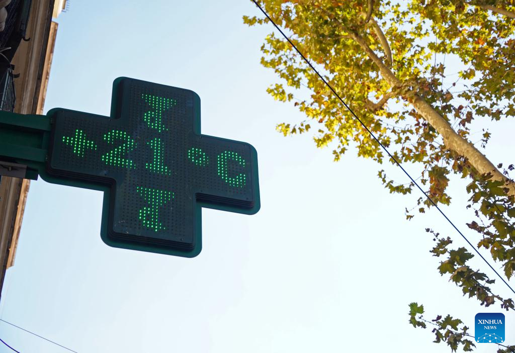 This photo taken on Nov. 11, 2022 shows a thermometer displaying real time temperature as 21 degrees Celsius in Rome, Italy. Large swathes of northern Italy have this year experienced the hottest October since records began in 1800, Italy's National Research Council said Tuesday. (Xinhua/Jin Mamengni)