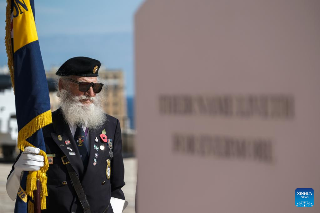 People participate in a commemoration of Armistice Day at the Saluting Battery in Valletta, Malta, on Nov. 11, 2022. (Photo by Jonathan Borg/Xinhua)