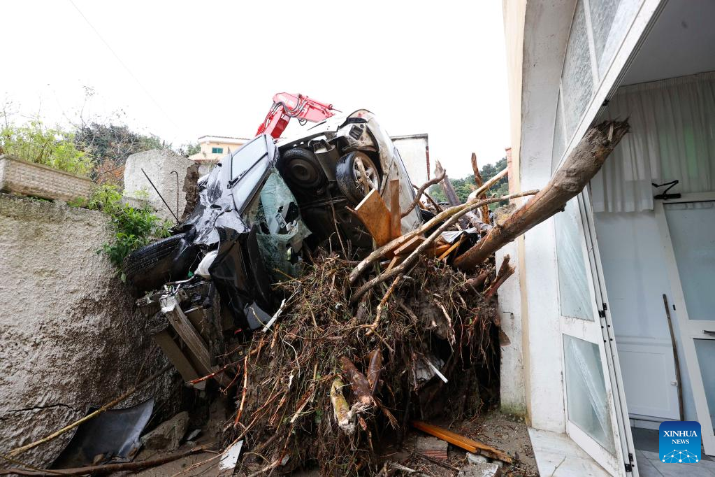 This photo taken on Nov. 26, 2022 shows damaged cars after a landslide on the island of Ischia, Italy. At least one person died and several others went missing in the island of Ischia in southern Italy on Saturday, after heavy rains triggered a landslide hitting several residential buildings, according to authorities and local media. (Str/Xinhua)
