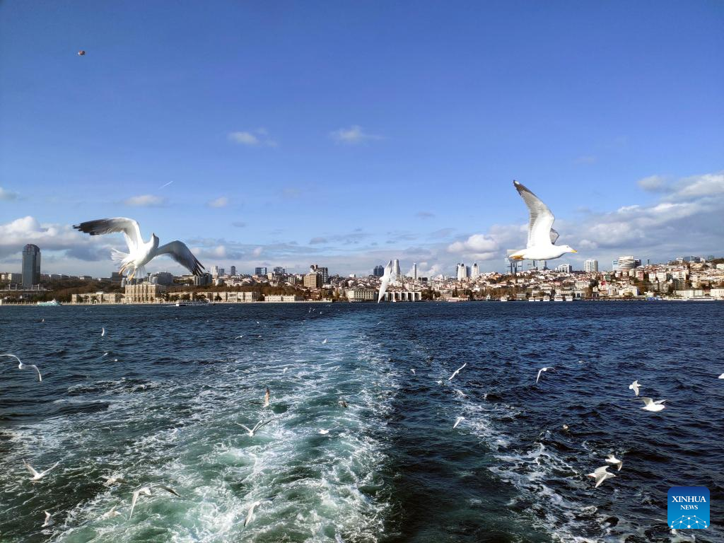 This photo taken on Nov. 27, 2022 shows seagulls flying over the Bosporus Strait in Istanbul, Türkiye. (Xinhua/Shadati)