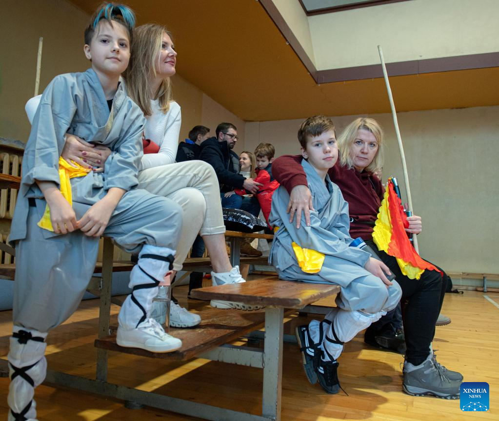 Athletes participate in the 8th Lithuanian Wushu (Kung Fu) Championship in Vilnius, Lithuania, on Dec. 10, 2022. The 8th Lithuanian Wushu (Kung Fu) Championship kicked off on Dec. 10, attracting nearly 100 competitors from Lithuania, Poland, Estonia, India and other countries to take part in. (Photo by Alfredas Pliadis/Xinhua)