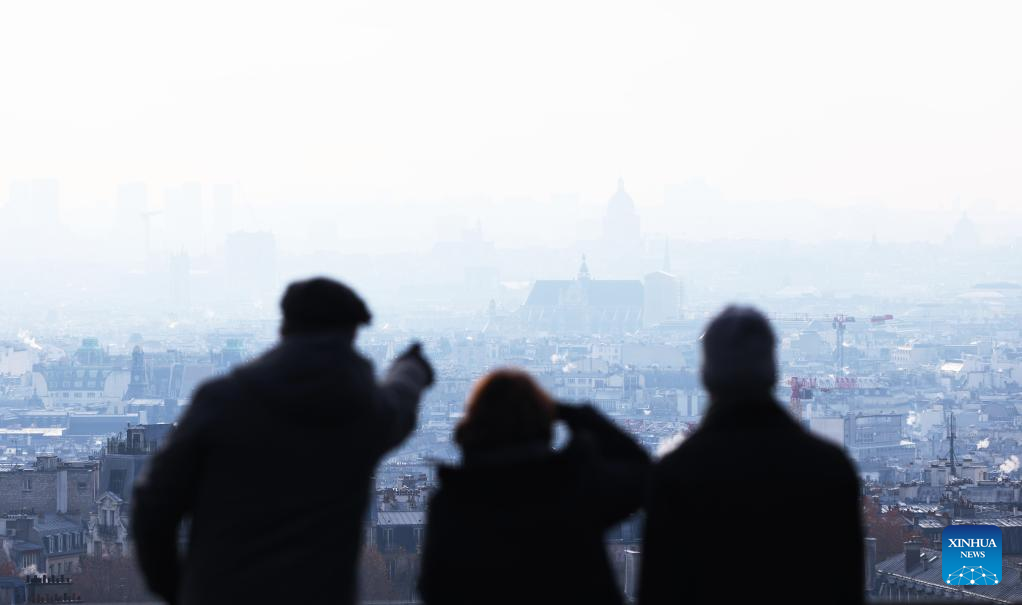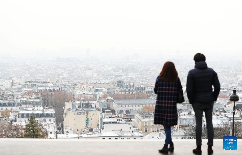 People look at the city of Paris covered with snow at the Montmartre in Paris, France, Dec. 14, 2022. (Xinhua/Gao Jing)