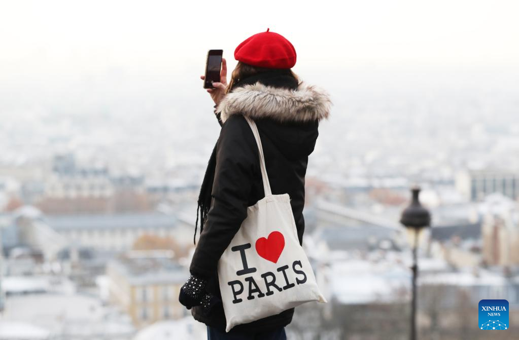 A woman takes photos of the city of Paris covered with snow at the Montmartre in Paris, France, Dec. 14, 2022. (Xinhua/Gao Jing)