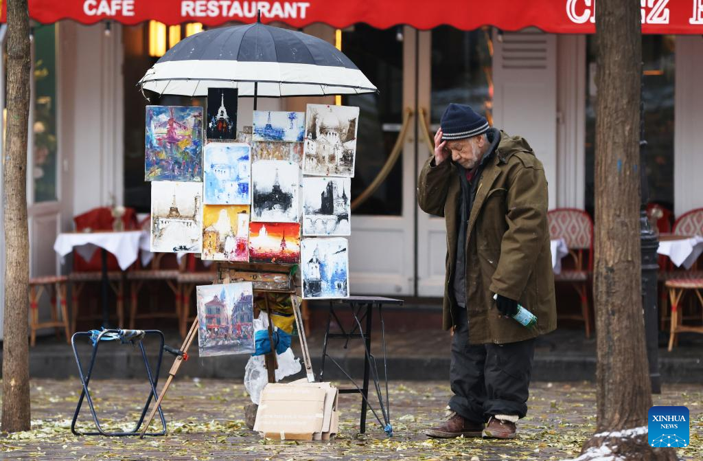 A street artist waits for customers at the Montmartre after snow in Paris, France, Dec. 14, 2022. (Xinhua/Gao Jing)