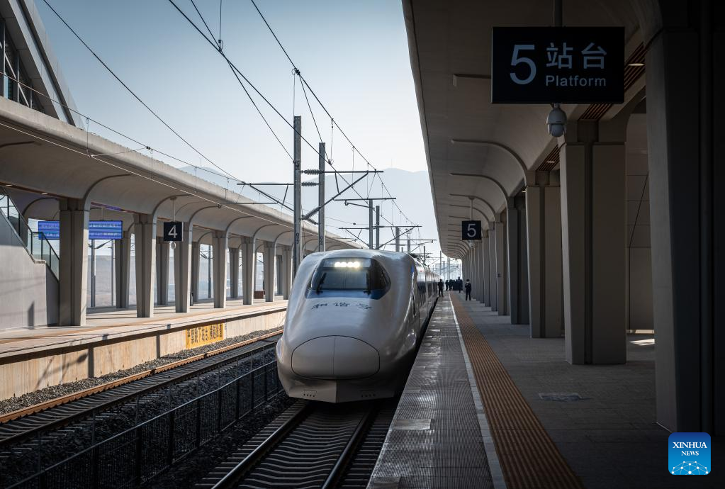 The first passenger train for official operation leaves Honghe Station along the Mile-Mengzi high-speed railway in Honghe Hani and Yi Autonomous Prefecture, southwest China's Yunnan Province, on Dec. 16, 2022. A high-speed railway, linking the cities of Mengzi and Mile in southwest China's Yunnan Province, entered operation on Friday. With a designed speed of 250 km per hour, the new railway has slashed the travel time between Mengzi and Kunming, the provincial capital, to 69 minutes. (Xinhua/Wang Guansen)