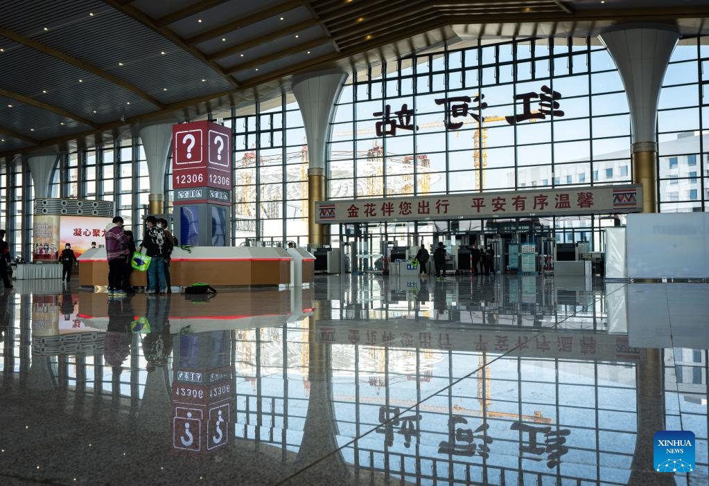 This photo taken on Dec. 16, 2022 shows the waiting hall of Honghe Station along the Mile-Mengzi high-speed railway in Honghe Hani and Yi Autonomous Prefecture, southwest China's Yunnan Province. A high-speed railway, linking the cities of Mengzi and Mile in southwest China's Yunnan Province, entered operation on Friday. With a designed speed of 250 km per hour, the new railway has slashed the travel time between Mengzi and Kunming, the provincial capital, to 69 minutes. (Xinhua/Wang Guansen)