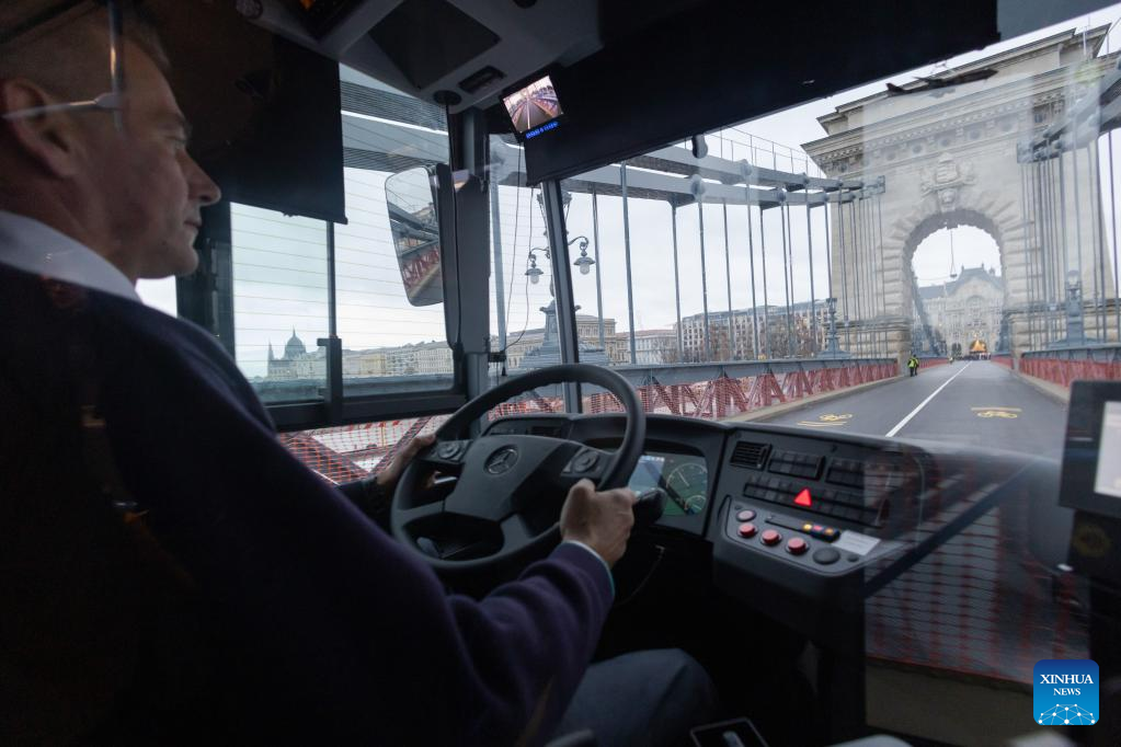 A bus driver drives through the reopened Chain Bridge in Budapest, Hungary, on Dec. 16, 2022. After being closed down for more than one and a half year for restoration, the Chain Bridge of Budapest has been reopened to traffic here on Friday. (Photo by Attila Volgyi/Xinhua)