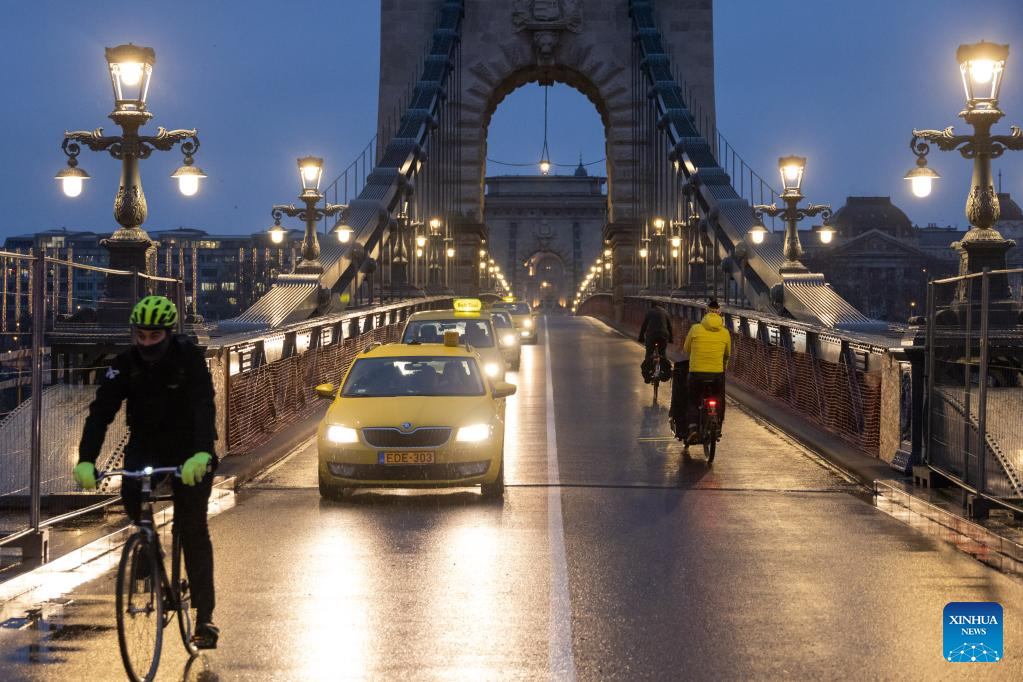 Bicycles and taxis move through the reopened Chain Bridge in Budapest, Hungary, on Dec. 16, 2022. After being closed down for more than one and a half year for restoration, the Chain Bridge of Budapest has been reopened to traffic here on Friday. (Photo by Attila Volgyi/Xinhua)