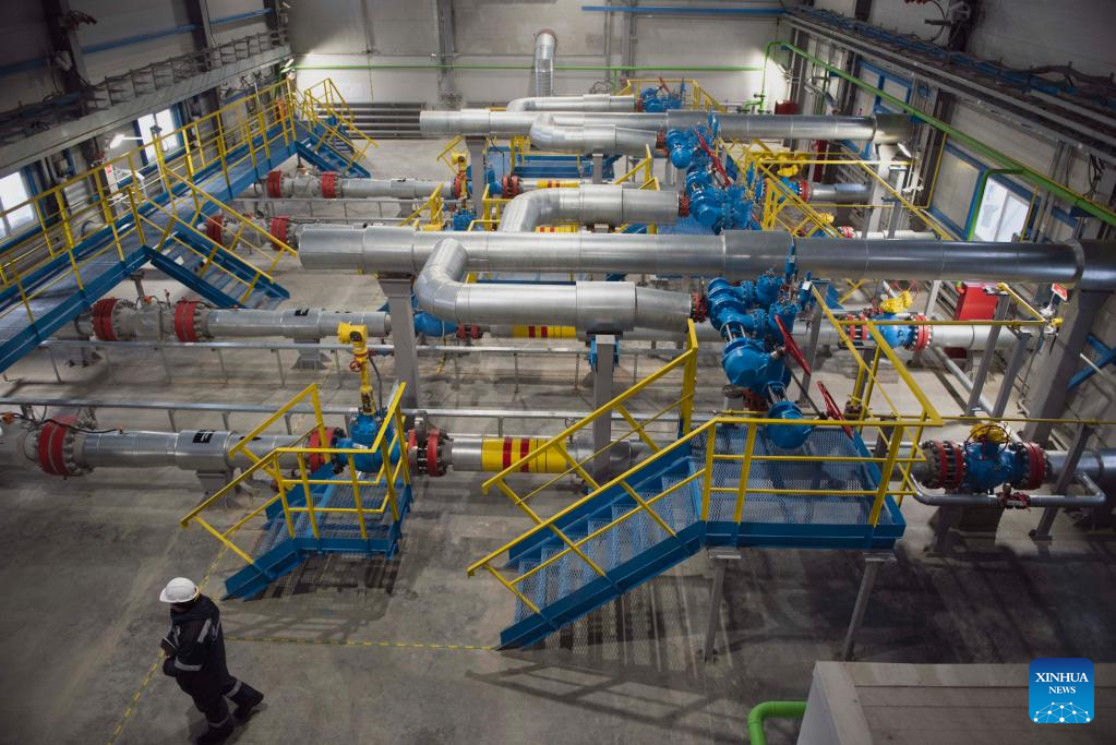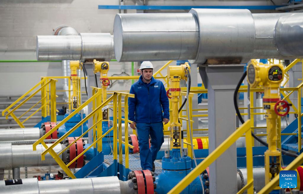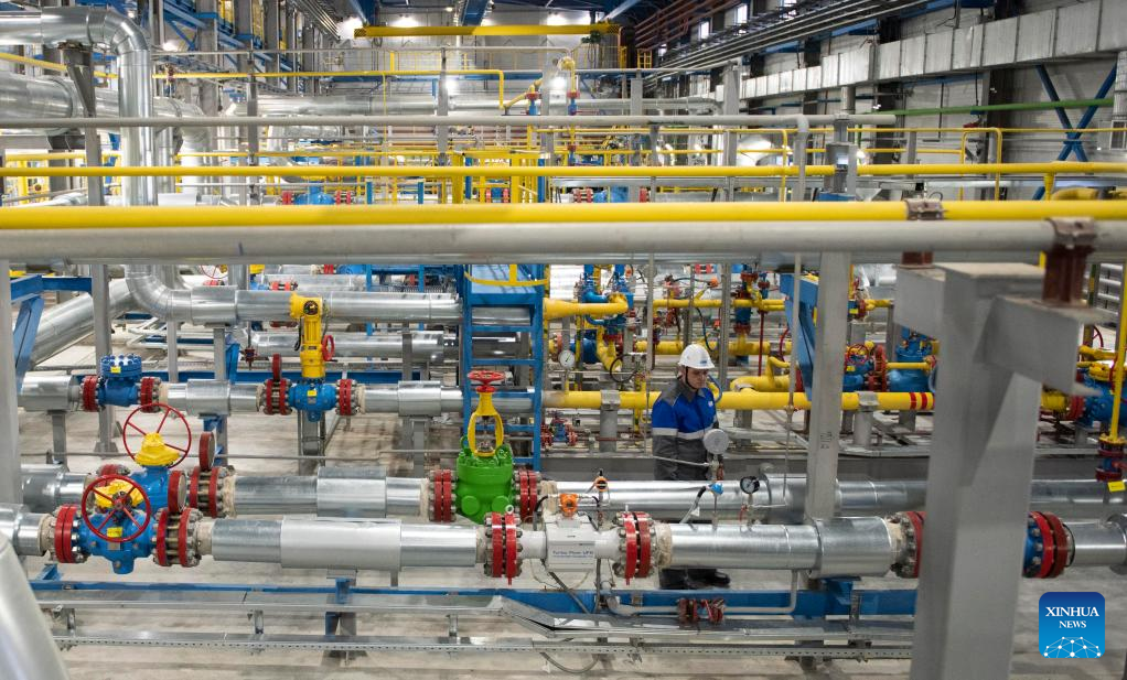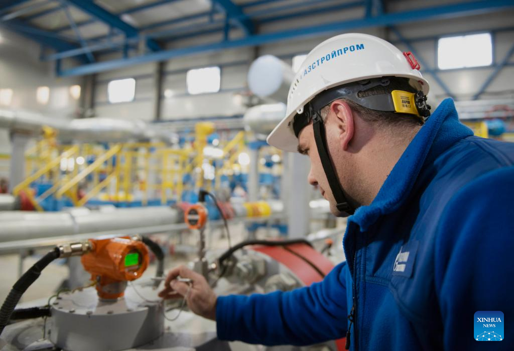 A staff member checks equipment at Kovykta gas condensate field in Irkutsk, Russia, Dec. 18, 2022. A new gas field and a new pipeline section were connected on Wednesday to Russia's Power of Siberia pipeline, indicating full completion of the major gas route. (Xinhua/Meng Jing)