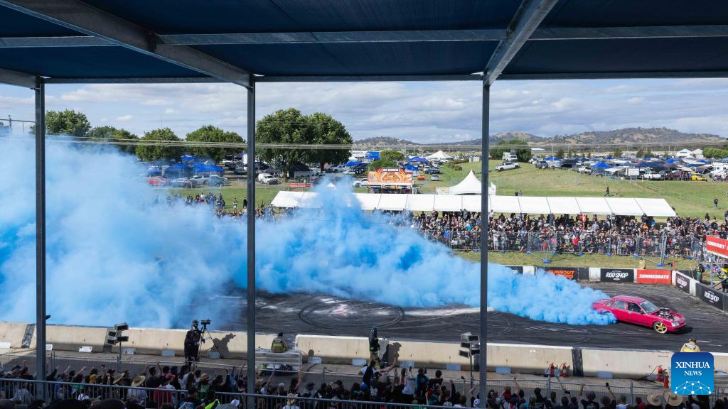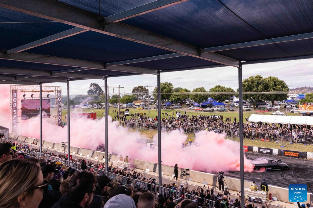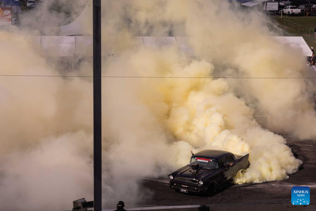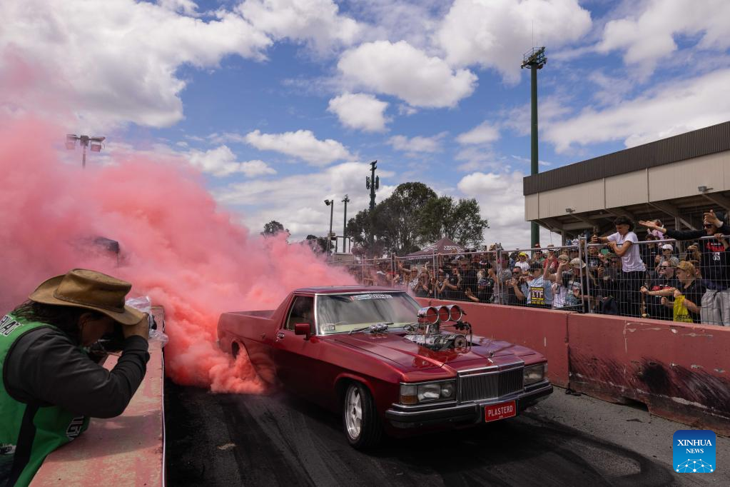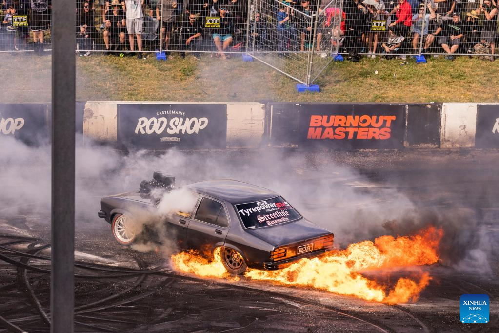 A car does a burnout during the Summernats car festival at the Exhibition Park in Canberra, Australia, Jan. 5, 2023. The 35th Summernats car festival kicked off here on Thursday. (Photo by Chu Chen/Xinhua)