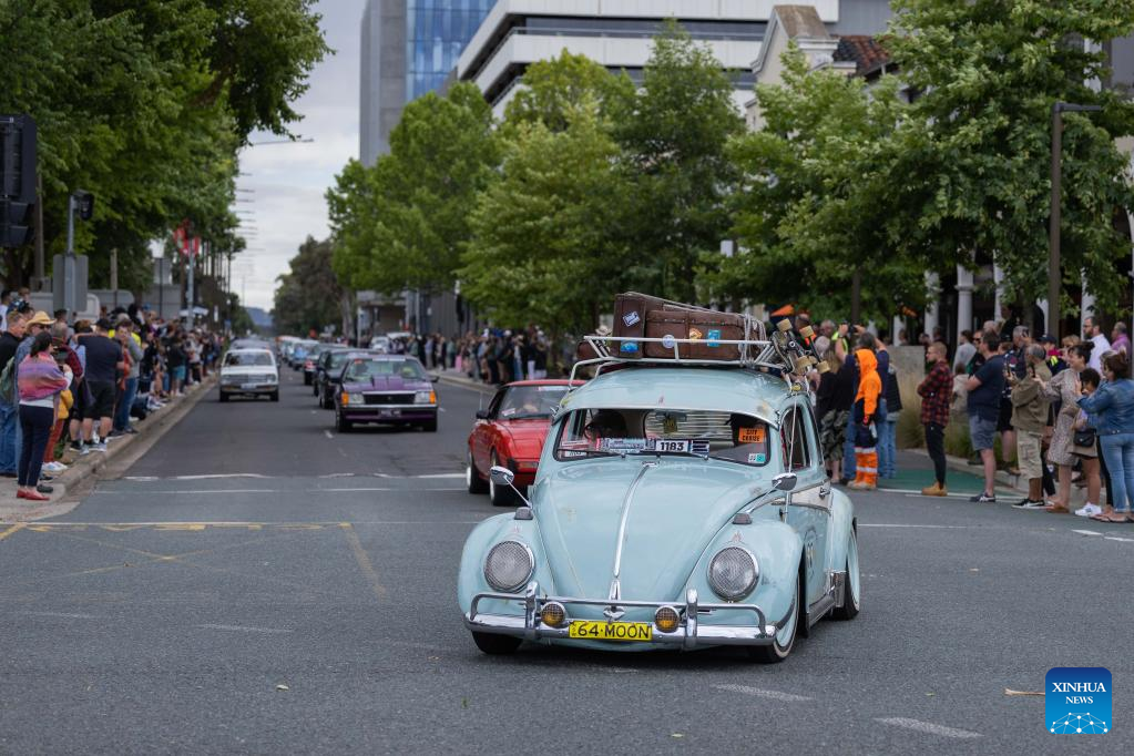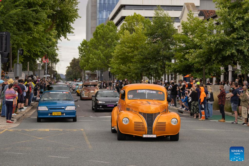Cars take part in a city cruise during the Summernats car festival in Canberra, Australia, Jan. 5, 2023. The 35th Summernats car festival kicked off here on Thursday. (Photo by Chu Chen/Xinhua)