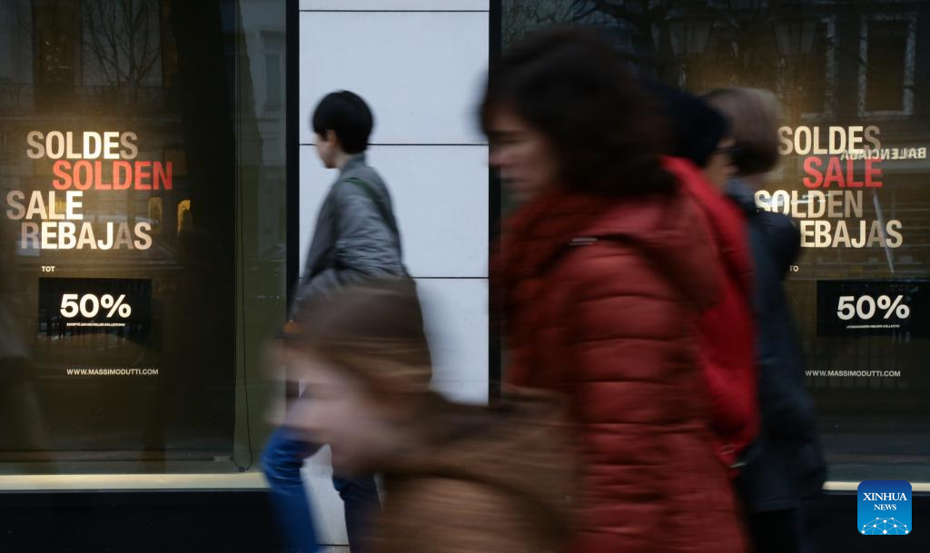 Pedestrians walk on a business street in Brussels, Belgium, Jan. 3, 2023. Inflation in the eurozone is expected to have dropped for a second consecutive month in December 2022 to 9.2 percent year-on-year, according to preliminary data published by Eurostat, the statistical office of the European Union (EU), on Friday. (Xinhua/Zheng Huansong)