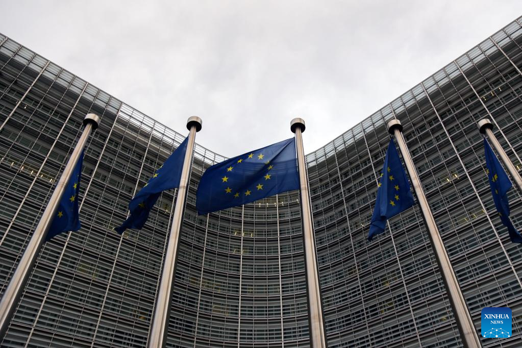 EU flags are seen outside the European Commission in Brussels, Belgium, Jan. 6, 2023. Inflation in the eurozone is expected to have dropped for a second consecutive month in December 2022 to 9.2 percent year-on-year, according to preliminary data published by Eurostat, the statistical office of the European Union (EU), on Friday. (Xinhua/Zheng Huansong)