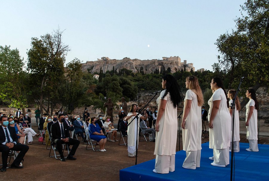 Performers of the Greek National Opera perform during the opening ceremony of the China-Greece Year of Culture and Tourism, in Athens, Greece on Sept. 16, 2021. (Xinhua/Marios Lolos)