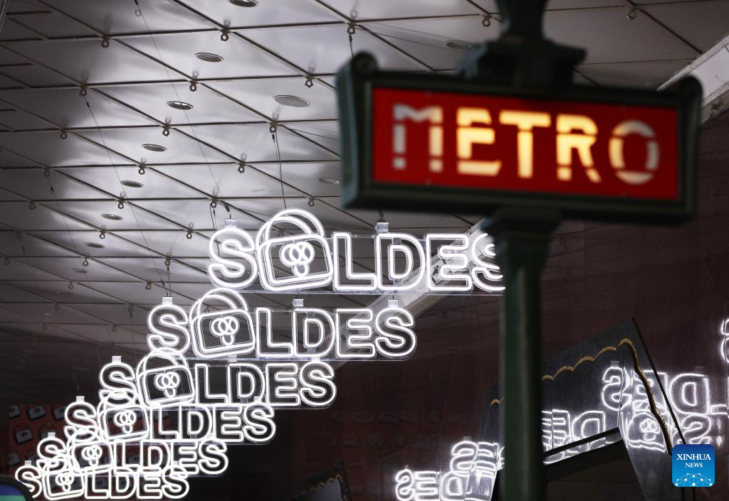 This photo taken on Jan. 11, 2023 shows promotion signs on the first day of winter sales in Paris, France. France's 2023 winter sales began on Wednesday and will run through Feb. 7, 2023. (Xinhua/Gao Jing)