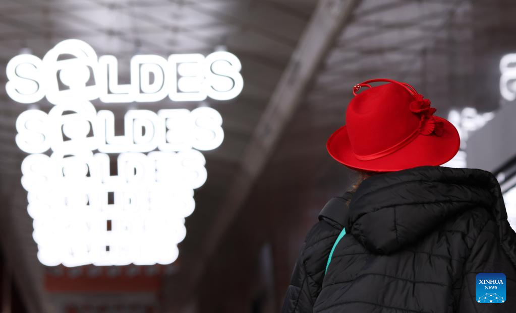 A woman walks into a department store on the first day of winter sales in Paris, France, Jan. 11, 2023. France's 2023 winter sales began on Wednesday and will run through Feb. 7, 2023. (Xinhua/Gao Jing)