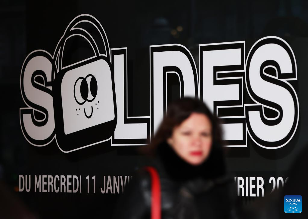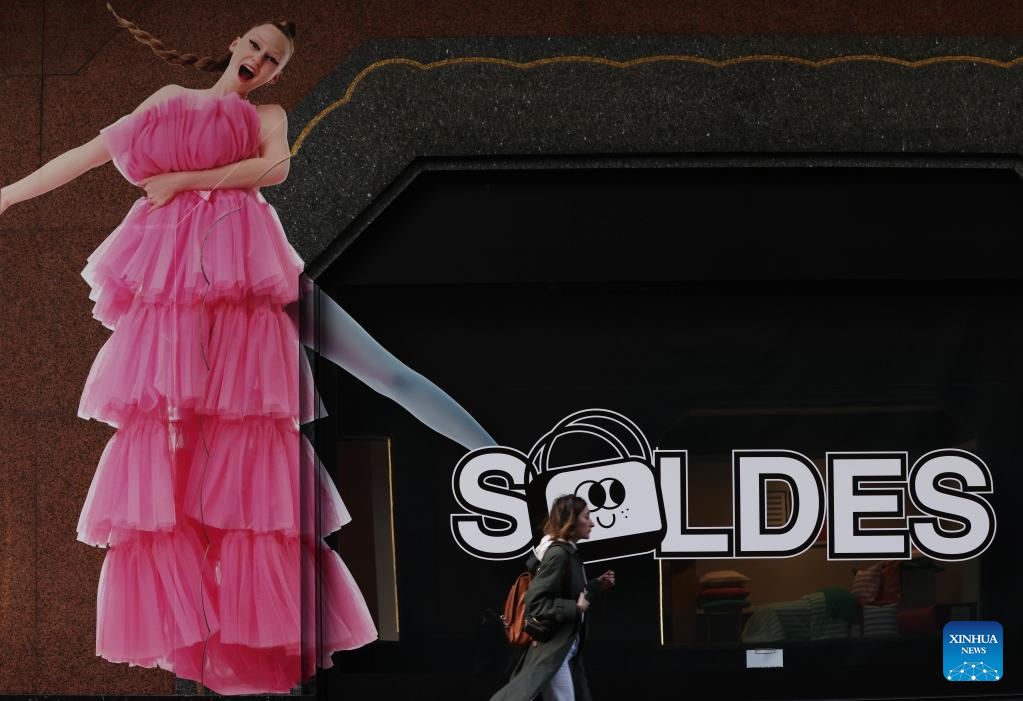 A woman walks past promotion signs on the first day of winter sales in Paris, France, Jan. 11, 2023. France's 2023 winter sales began on Wednesday and will run through Feb. 7, 2023. (Xinhua/Gao Jing)
