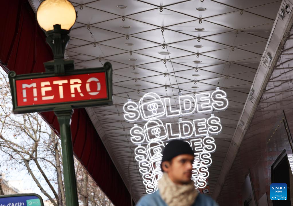 A man walks past promotion signs on the first day of winter sales in Paris, France, Jan. 11, 2023. France's 2023 winter sales began on Wednesday and will run through Feb. 7, 2023. (Xinhua/Gao Jing)