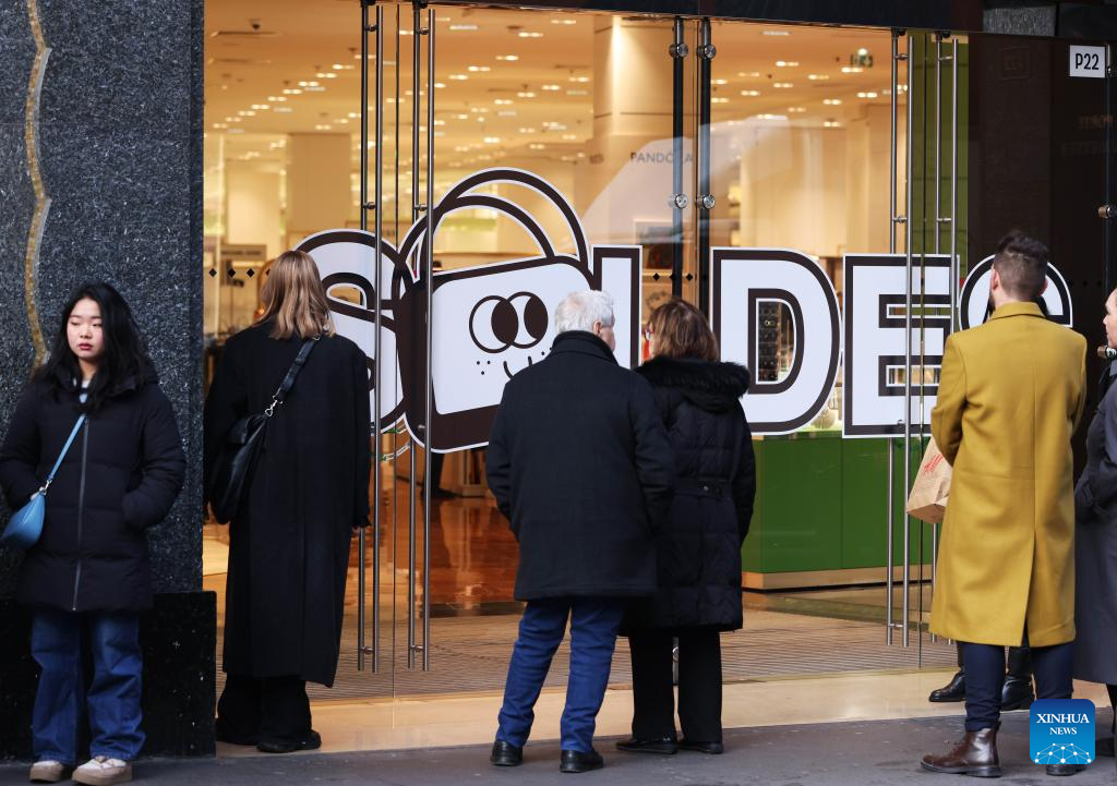 People wait outside a department store on the first day of winter sales in Paris, France, Jan. 11, 2023. France's 2023 winter sales began on Wednesday and will run through Feb. 7, 2023. (Xinhua/Gao Jing)