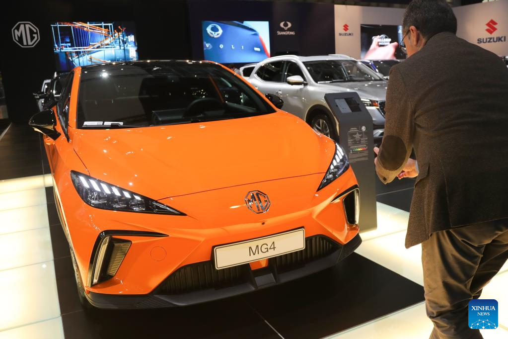 A man takes photos of an MG4 electric car during a media preview of the 100th Brussels Motor Show in Brussels, Belgium, Jan. 13, 2023. A fleet of luxury electric vehicles (EV) from Chinese manufacturers were showcased for the first time this week at the 100th Brussels Motor Show, which opened its doors to industry professionals and media on Friday. (Xinhua/Zheng Huansong)