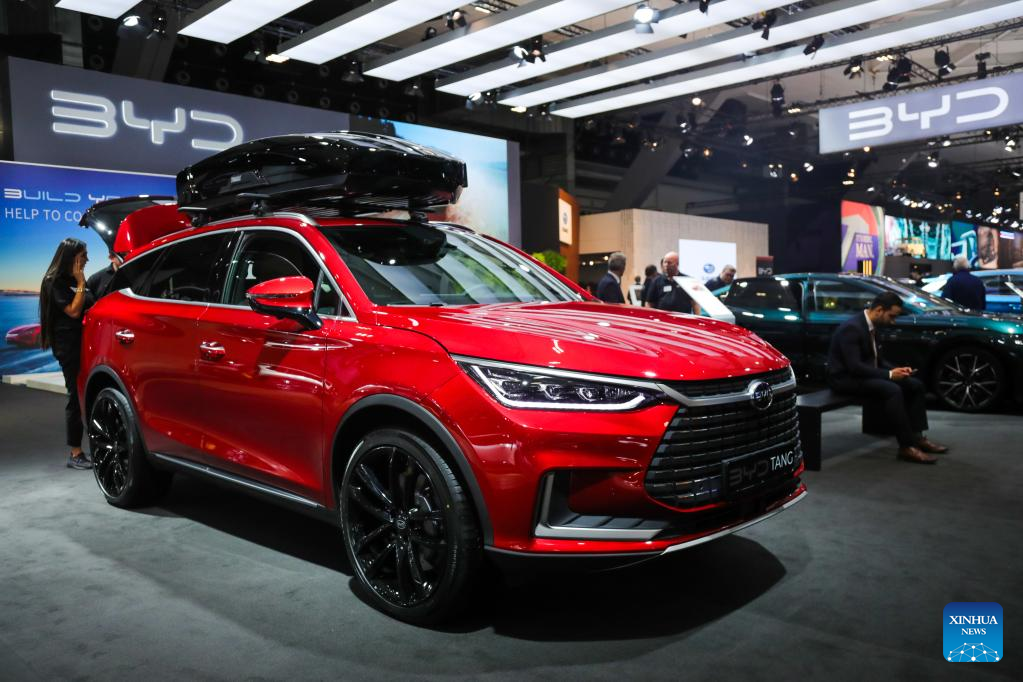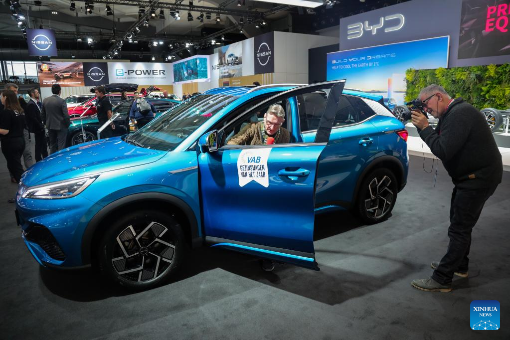 People experience a BYD Tang electric car during a media preview of the 100th Brussels Motor Show in Brussels, Belgium, Jan. 13, 2023. A fleet of luxury electric vehicles (EV) from Chinese manufacturers were showcased for the first time this week at the 100th Brussels Motor Show, which opened its doors to industry professionals and media on Friday. (Xinhua/Zheng Huansong)