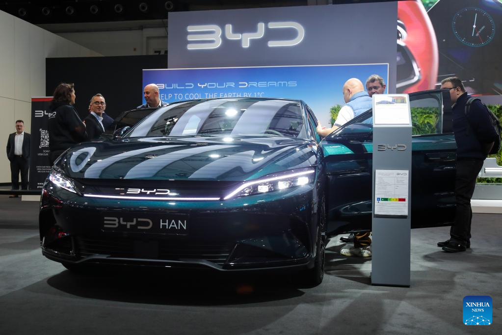 People experience a BYD Han electric car during a media preview of the 100th Brussels Motor Show in Brussels, Belgium, Jan. 13, 2023. A fleet of luxury electric vehicles (EV) from Chinese manufacturers were showcased for the first time this week at the 100th Brussels Motor Show, which opened its doors to industry professionals and media on Friday. (Xinhua/Zheng Huansong)